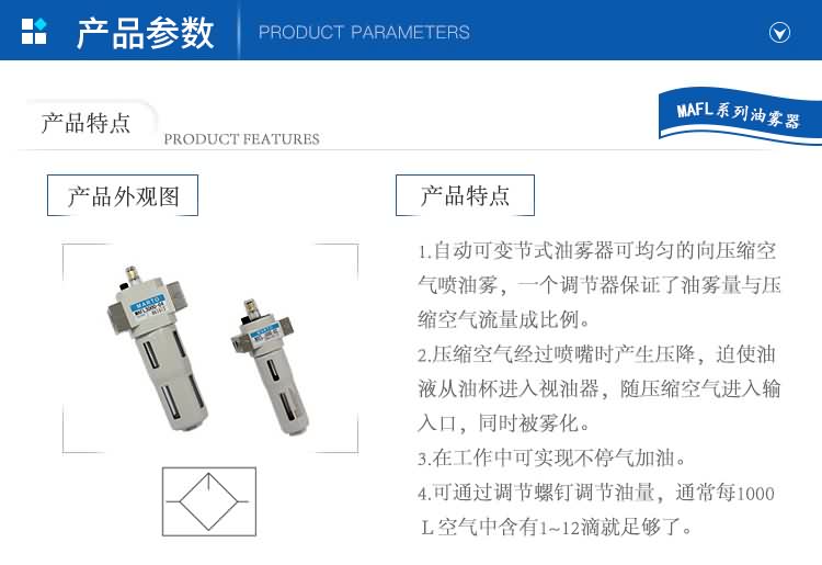 1.自動可變節(jié)式油霧器可均勻的向壓縮空氣噴油霧,一個調(diào)節(jié)器保證了油霧量與壓縮空氣流量成比例。